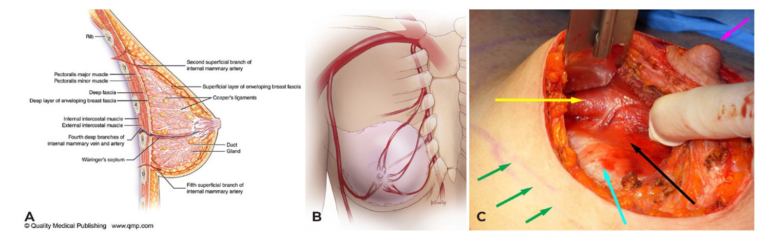 (C) The deep artery and vena comitans are shown during surgery in the left breast. The green arrows mark the inframammary fold. The light blue arrow marks the fifth rib. The nipple is marked with a pink arrow. The black arrow marks the intercostal muscle and the yellow arrow marks the pectoralis major muscle.